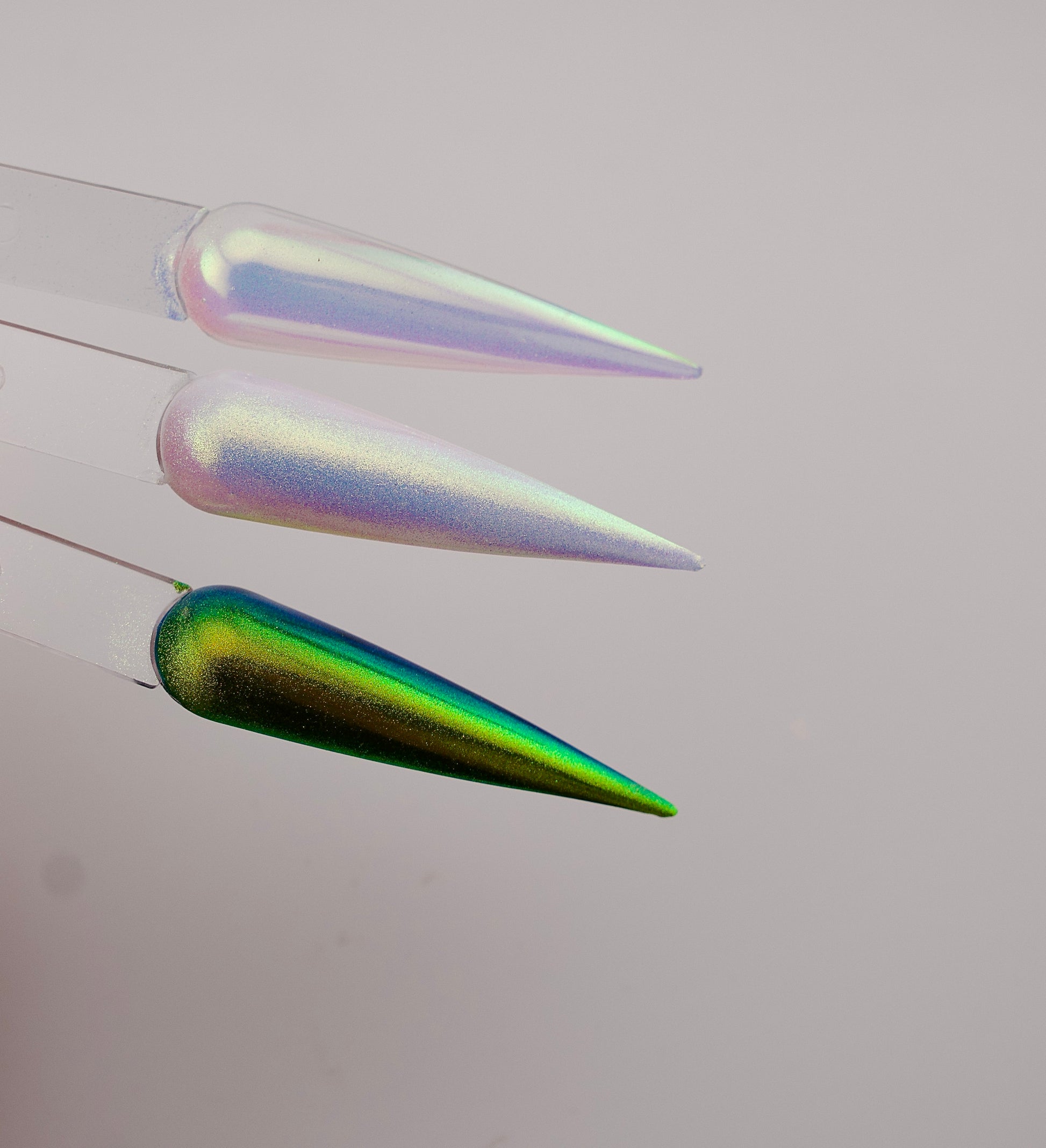 Hiệu ứng chrome kỳ ảo như ánh cầu vồng, ánh sáng long lanh thay đổi theo từng góc nhìn, cho bộ móng vừa ngọt ngào vừa sang chảnh.